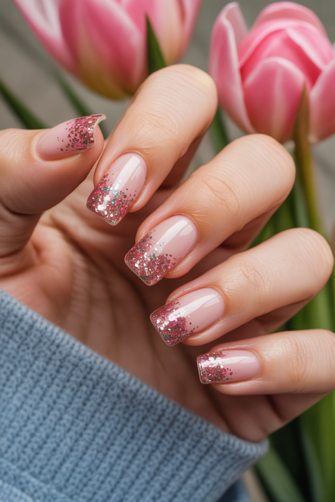 This design features a soft pale pink base that blends smoothly into glittery tips. The gradient effect adds subtle sparkle without overwhelming the look. It suits both short and long nails and works well for everyday wear or special occasions.