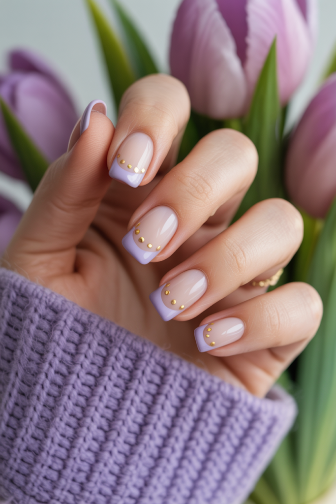 This manicure features soft pastel lilac tips paired with a clear or neutral base. Small gold dots add a delicate and elegant detail along the smile line. It works well for those who want a subtle yet stylish look for March.