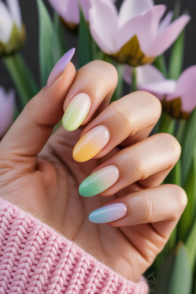 Pastel ombre almond nails blend soft colors with a smooth gradient effect. This style gives a fresh, delicate look that suits spring well. The almond shape adds elegance and complements the gentle pastel shades beautifully. It works for both casual and formal occasions.