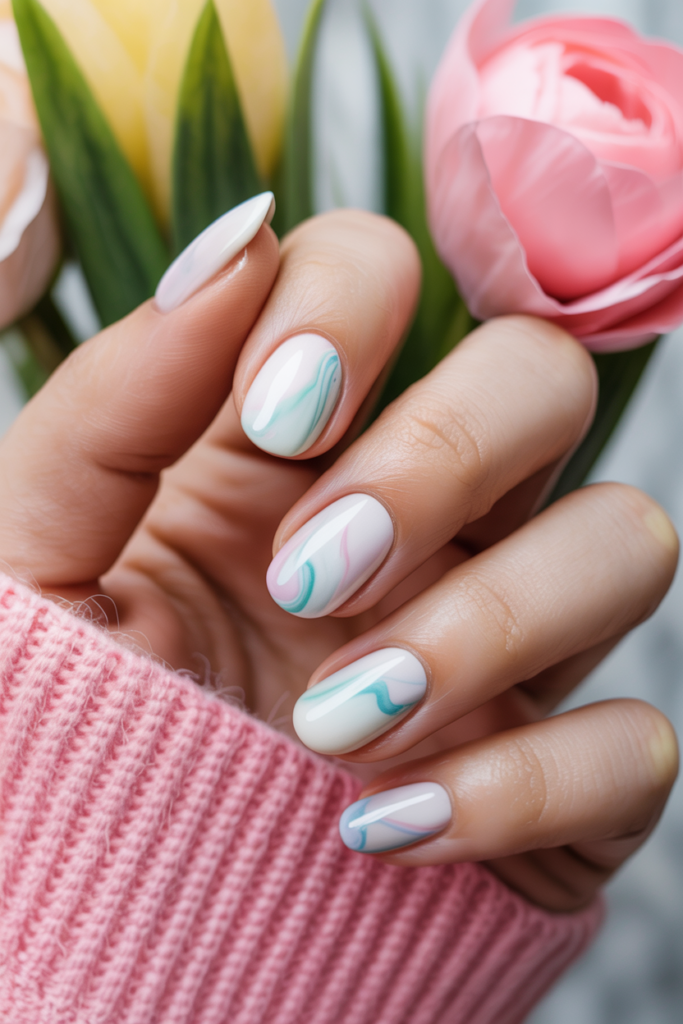 This nail design pairs a clean white base with soft pastel swirls. The marble effect adds subtle movement without overwhelming the look.