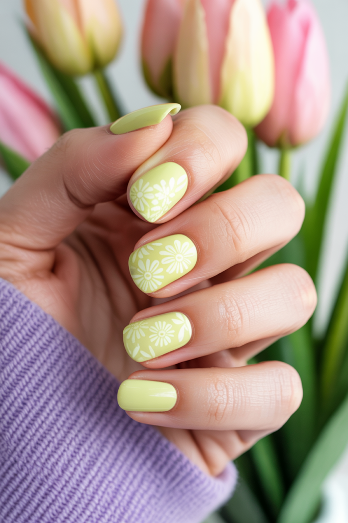This look features a soft pastel yellow base that is calm and elegant. Floral stamping adds delicate designs, giving the nails a fresh, springtime feel.