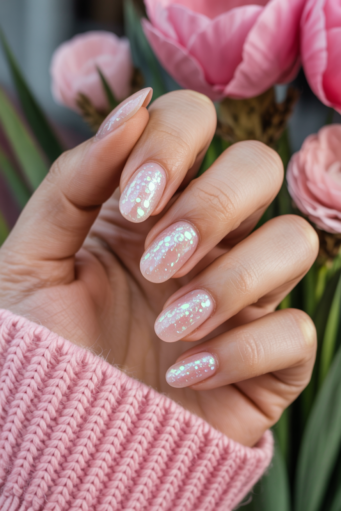 This nail design features a soft pink base that looks clean and simple. Iridescent glitter is added near the cuticles, creating a subtle sparkle. The effect is elegant without being too flashy, making it suitable for both everyday wear and special occasions.
