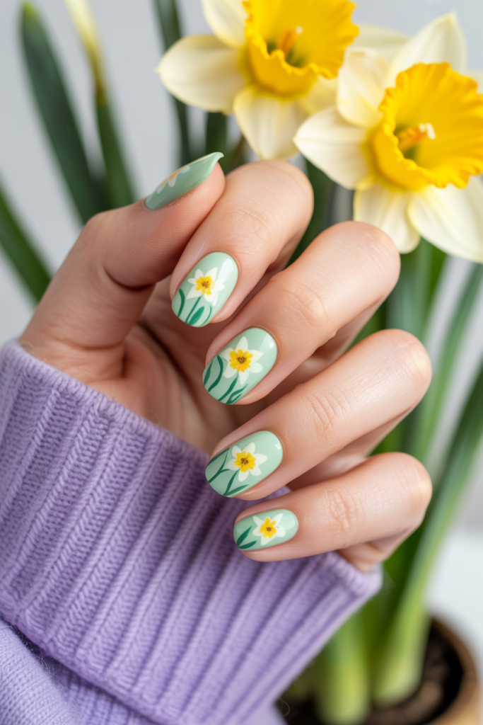 This nail design pairs a gentle seafoam green base with bright daffodil flower decals. The soft green creates a calm, fresh look that suits spring.