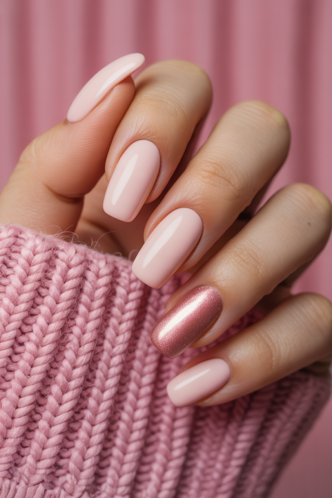This style pairs soft blush pink matte nails with glossy tips. The contrast creates a modern and elegant look.