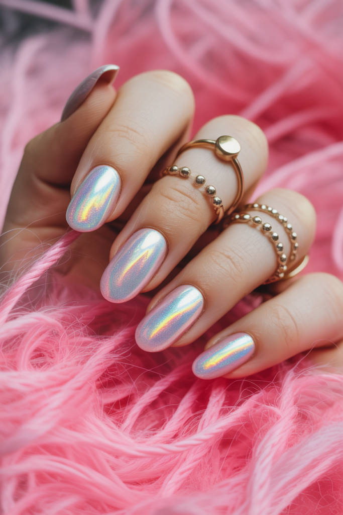 This nail design mixes soft pastel pink with a shiny holographic finish. It gives nails a smooth, colorful shine that changes with light. The look is simple but eye-catching, perfect for those who want a subtle yet modern style.