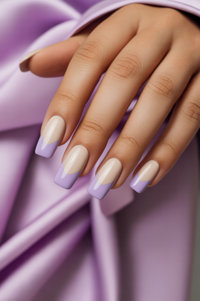 This nail design pairs a soft creamy beige with a light lavender shade. The colors blend well, creating a calm and elegant look. It works for both casual days and special occasions. The mix adds subtle contrast without being too bold.
