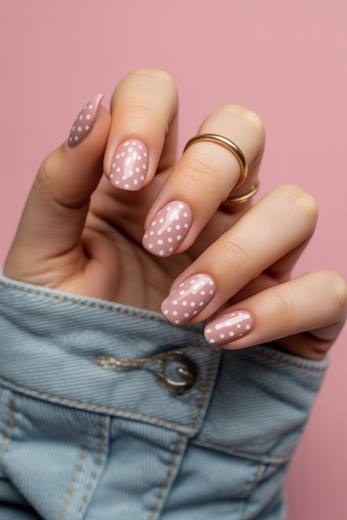 This design pairs a soft dusty rose base with simple white dots. The dots add a subtle touch without overpowering the muted pink tone.
