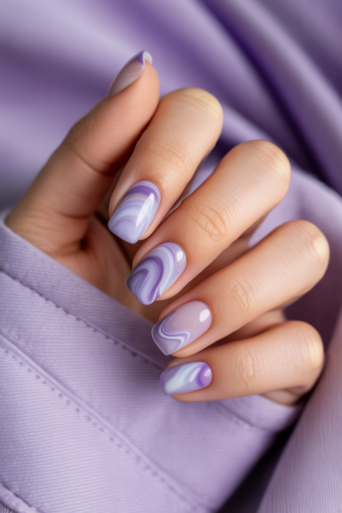 Faded lavender marble nails blend soft purple tones with gentle swirls. The look mixes light and deeper shades, creating a calm, artistic effect.