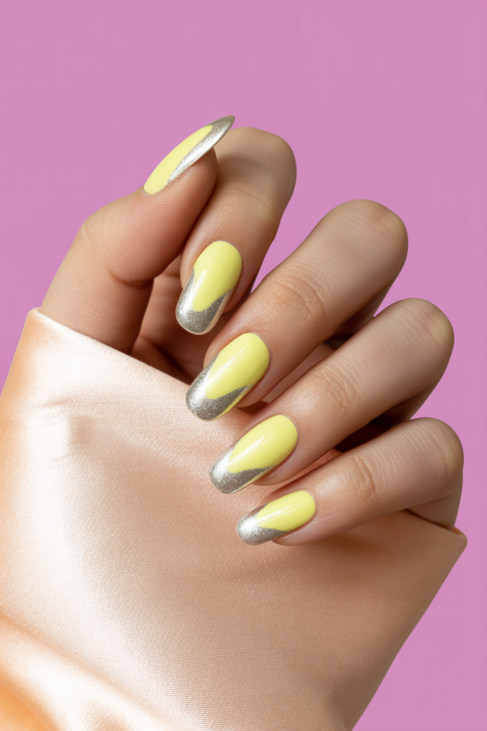 This design pairs soft pastel yellow nails with sharp silver tips. The silver edges add a modern twist to the gentle yellow base. It works well on various nail shapes and offers a balanced, stylish look that is both fresh and elegant.