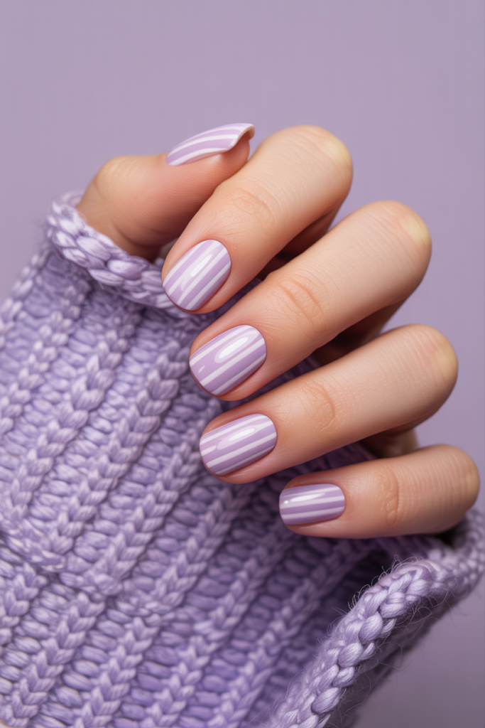 The lilac striped pattern combines soft purple shades with clean, simple lines. It often pairs lilac with white or pastel colors for a fresh look. This design works well for both short and long nails, adding a subtle yet stylish touch.