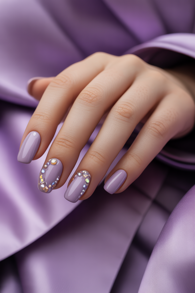 Lilac nails with subtle rhinestones add a touch of sparkle without being too bold. The soft purple shade keeps the look gentle and classy.