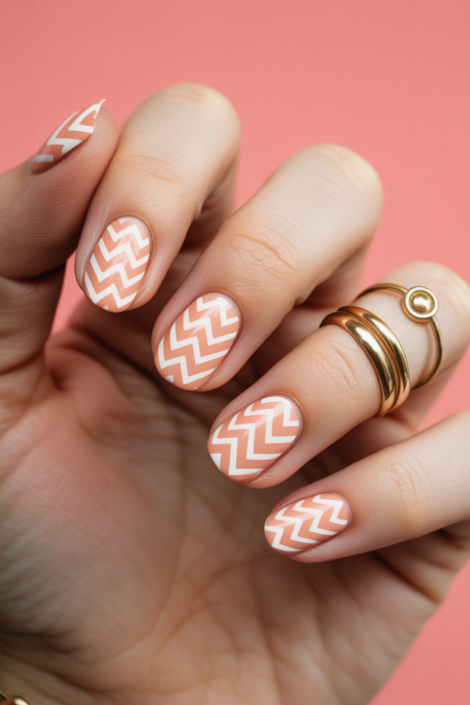 Muted coral adds a soft, refined touch to nails. The chevron pattern gives a modern, geometric look without being too bold. This design works well for those who want subtle color with a stylish edge. It pairs nicely with neutral tones for a balanced effect.