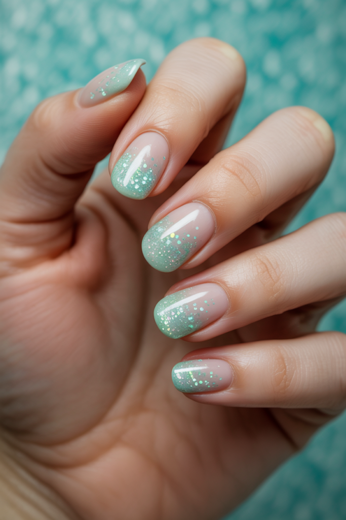 This design uses a soft mint base with a gradual glitter fade. The glitter adds a subtle sparkle without overpowering the pastel tone. It works well for both casual and formal occasions, offering a fresh and clean look.