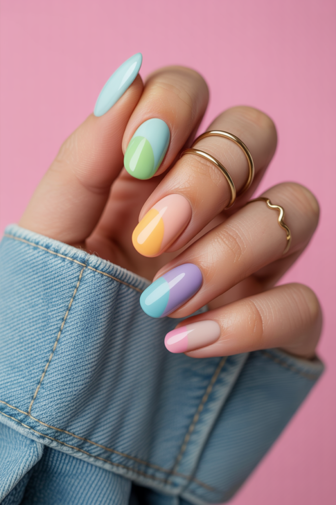 Pastel rainbow nails blend soft colors in a gentle gradient. They offer a fresh look without being too bold or heavy.