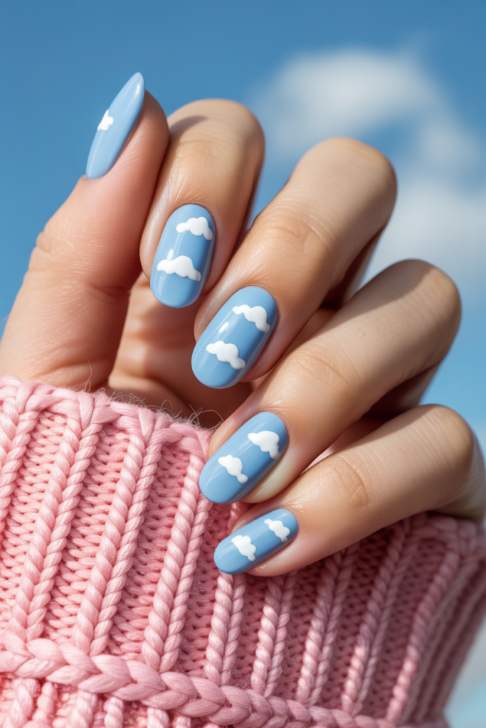 Sky blue nails with cloud detailing create a soft, calming look. The light blue base mimics a clear sky, while white cloud designs add a gentle touch. This style suits both casual and special occasions, offering a fresh and modern feel. The simple art keeps the manicure elegant and neat.