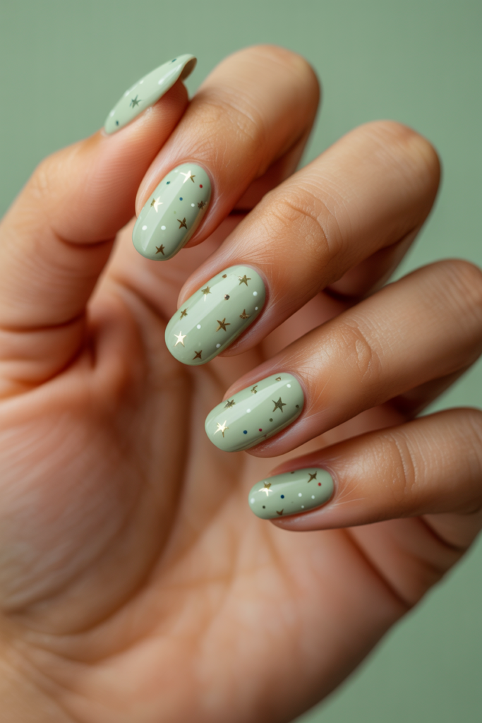 This look features a gentle pastel green base that feels calm and fresh. Small star shapes are scattered delicately across the nails, adding a subtle touch of sparkle. It works well for any occasion and suits different nail lengths.
