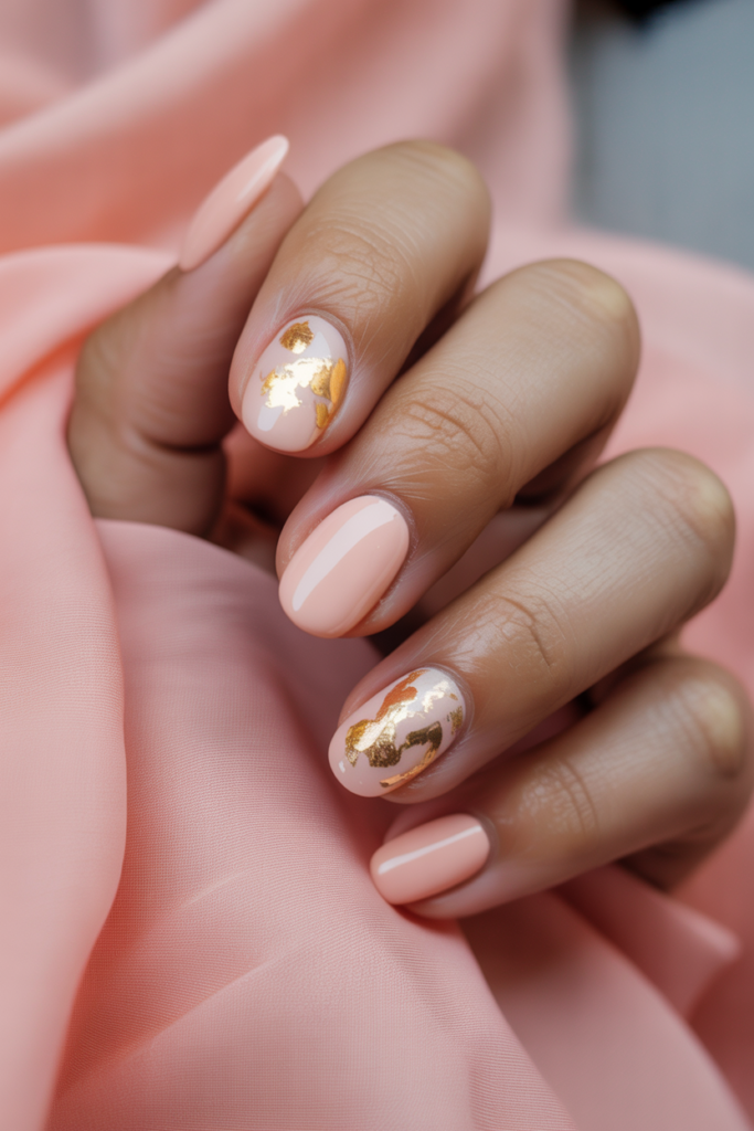 Soft peach nails offer a gentle, warm base that suits many styles. Adding gold foil creates a refined touch without being too flashy. This look works well for both casual and formal occasions. It brings subtle elegance while keeping the design simple and modern.