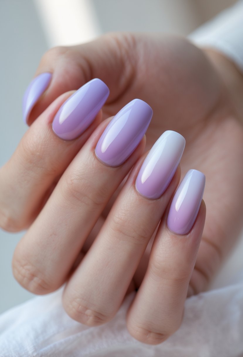 The lavender ombre gradient blends soft purple shades from light to darker tones. This style creates a smooth, elegant transition on the nails. It is versatile and fits both casual and formal settings. The look adds a calm and stylish touch to any manicure.