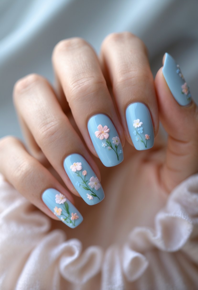 Powder blue nails offer a soft, calming base for delicate floral accents. These small flower details add subtle charm without overpowering the look.