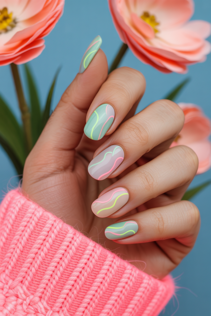 This design features bright neon lines over a soft pastel background. The thin neon strokes create a sharp contrast that draws attention without overwhelming the nail.
