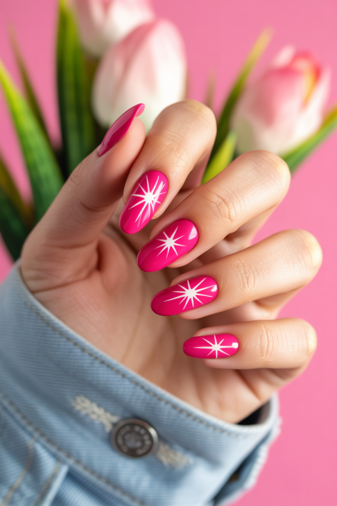 This design uses a bright pink base that catches attention instantly. Starburst patterns add a dynamic, energetic feel to the nails. The contrast between bold pink and precise star shapes creates a balanced, stylish look. It suits those who want a strong yet playful manicure for April.