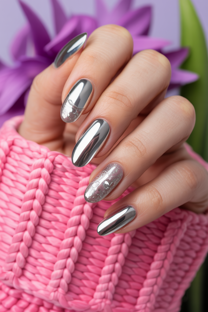 Chrome nails with silver accents create a sleek and modern look. The shiny chrome base pairs well with subtle silver details. This style adds depth without overpowering the design.