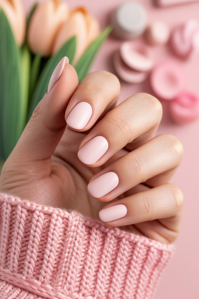 This look features a soft pink base topped with a matte finish. It gives nails a smooth, velvety texture without shine.