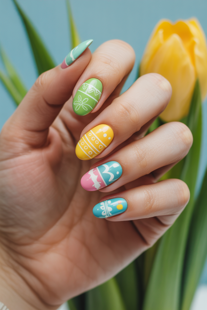 They use bright colors like pink, blue, yellow, and green. Patterns often include stripes, polka dots, and floral shapes. These designs mimic the look of decorated Easter eggs.
