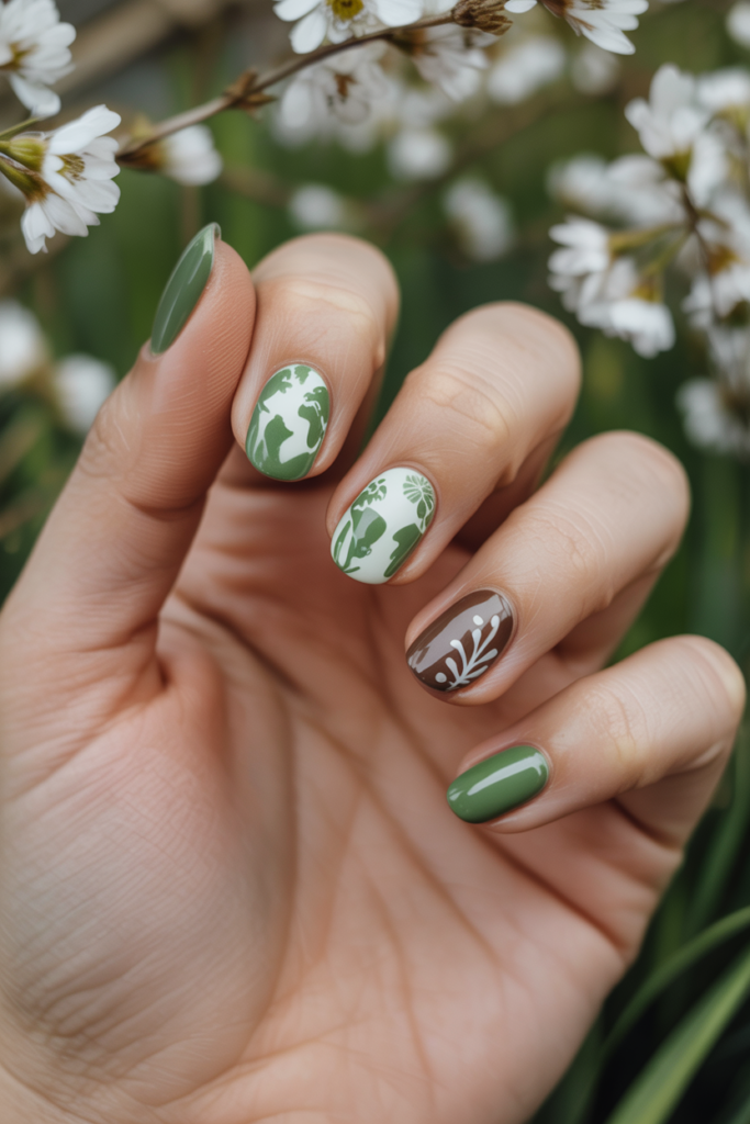 This design uses green and brown shades to reflect nature’s colors. It often features leaves, trees, or simple earthy patterns. The look is subtle but meaningful, celebrating Earth Day in a stylish way. It suits those who appreciate natural, calm tones on their nails.