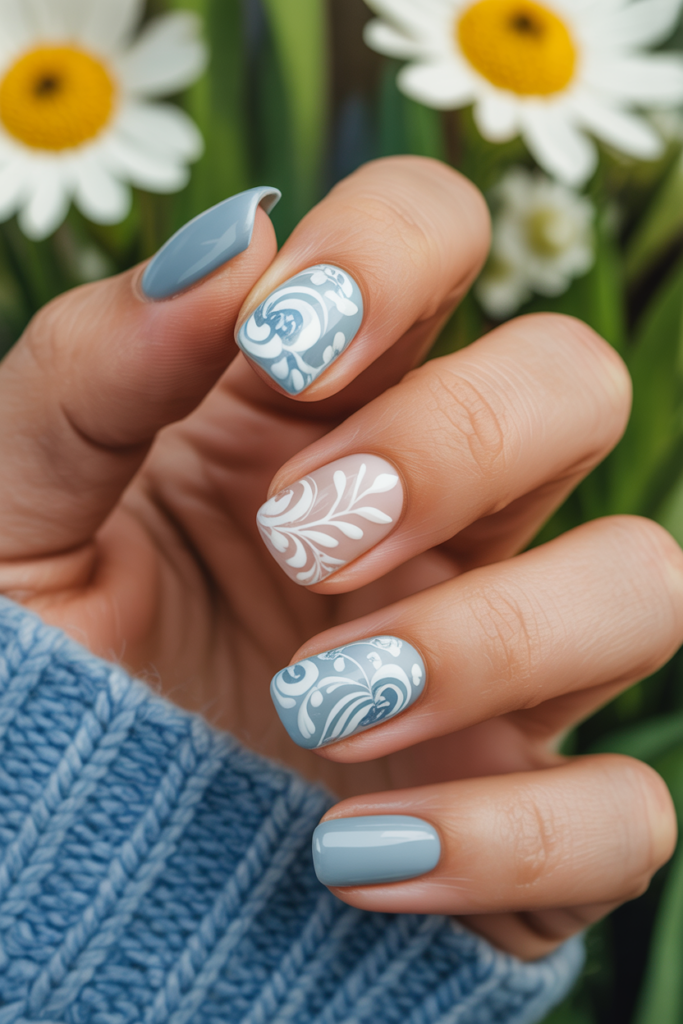 This design pairs a soft white base with light blue floral swirls. The patterns flow gently, creating a calm and elegant look. It suits spring well, offering a fresh and natural feel without being too bold. The style is simple but stylish for everyday wear.