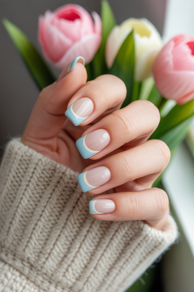 This design pairs soft pastel blue tips with a creamy base. The colors create a gentle, fresh look that suits many styles.