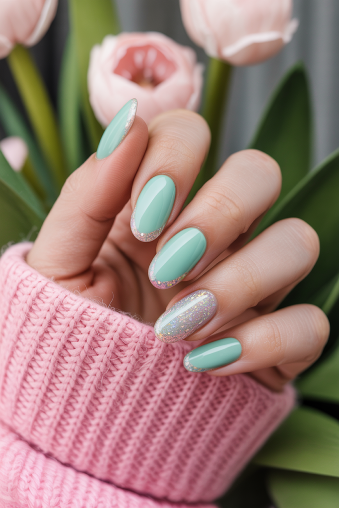 This design features smooth, glossy mint green nails that look clean and fresh. The tips are decorated with fine glitter, adding a subtle sparkle without being overpowering. It works well for both casual and slightly dressy occasions. The glitter provides just enough shine to catch the light.
