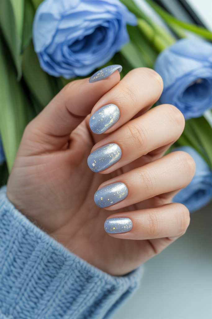 This design pairs a calm soft blue base with delicate silver glitter for a subtle shine. The glossy finish adds a smooth, polished look that works well for everyday wear or special events. Silver glitter highlights enhance the nails without overpowering the soft blue tone.