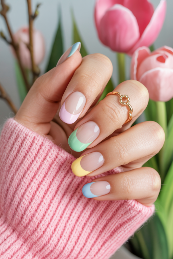 Gradient pastel French tips blend soft colors for a smooth, subtle look. They add a gentle touch of color without overpowering the nails. This style works well for spring and adds modern flair to the classic French manicure. It suits many occasions and styles.