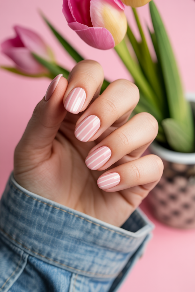 This design pairs soft matte pastel pink nails with thin, glossy stripes. The contrast highlights the delicate pink while adding subtle shine. It offers a simple yet stylish look that suits many occasions. The stripes give dimension without overwhelming the softness of the matte base.