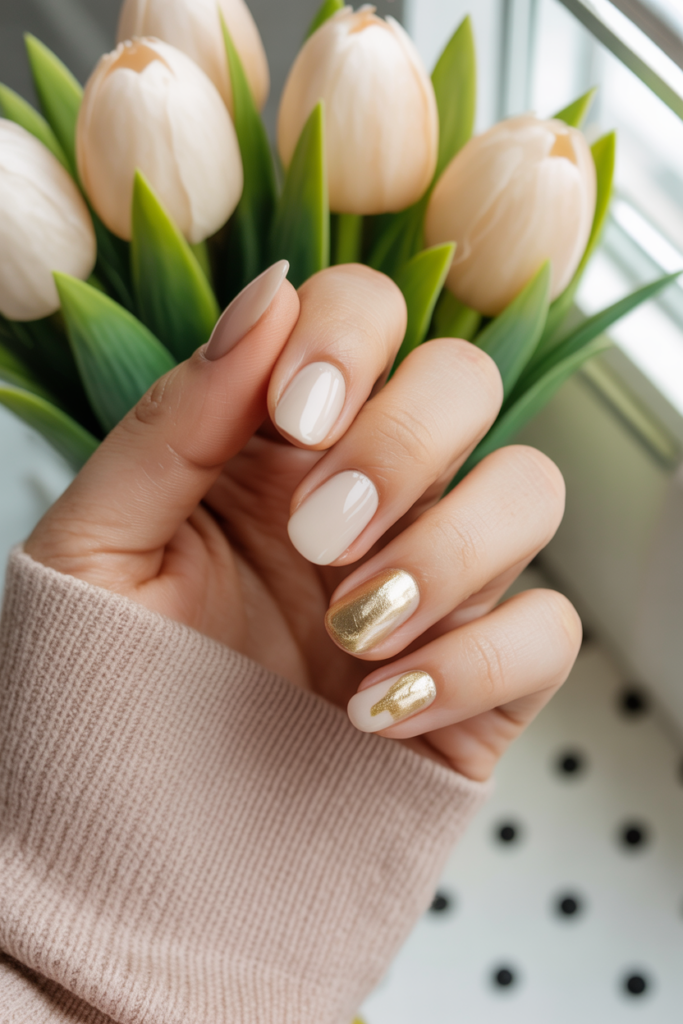 This design uses a soft beige base to keep nails neutral and simple. Thin gold foil details add a subtle shine without being too flashy.