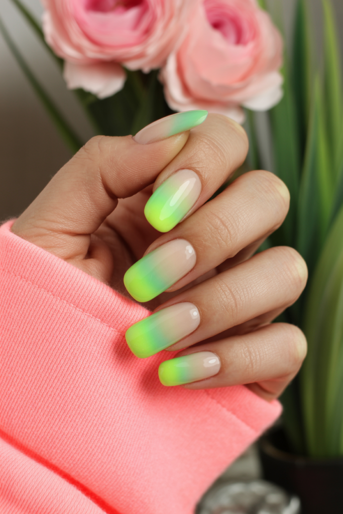 Neon ombre tips blend bright colors like pink, orange, and green in a smooth gradient. This style adds energy without covering the entire nail, keeping the look fresh and modern. It suits both short and long nails, ideal for a bold but simple statement.
