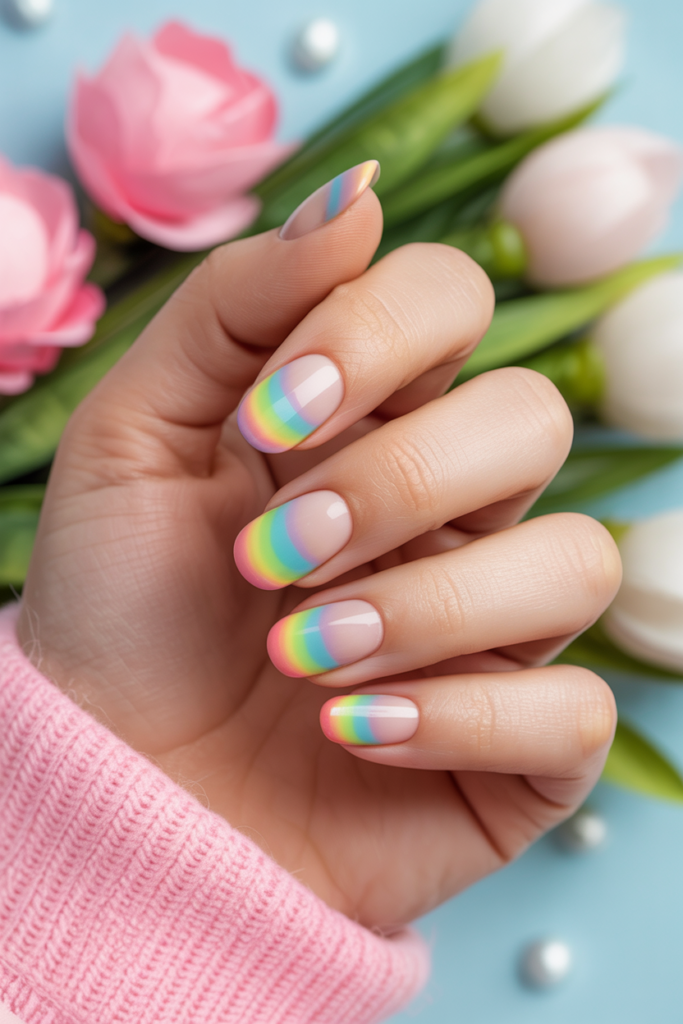 The pastel rainbow gradient features soft colors that blend smoothly across the nails. It uses light shades like pink, blue, and yellow for a gentle, colorful effect.