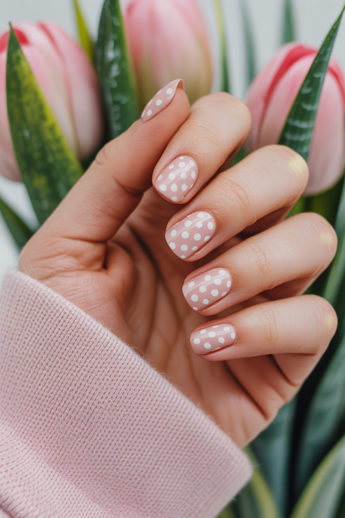 The pale pink base creates a soft, neat look that suits many styles. Small polka dots add subtle detail without overwhelming the design.