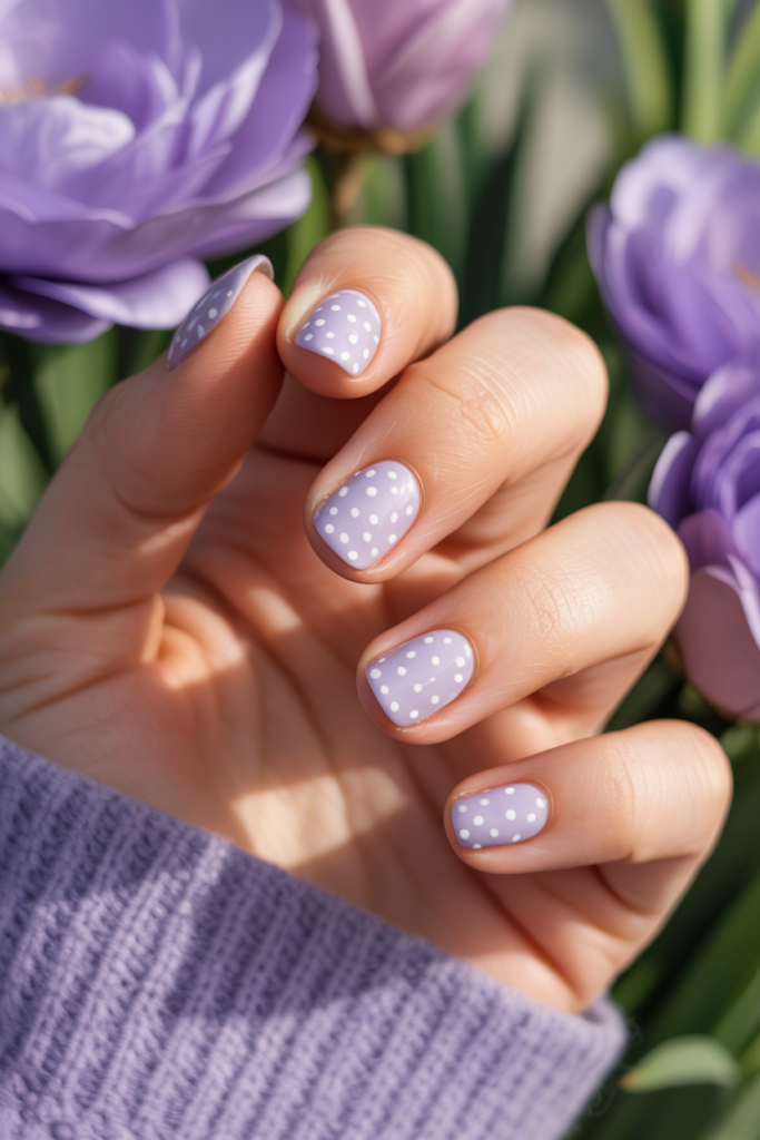 This design blends a soft lavender base with simple white dots for a clean, delicate look. It works well for those who want a subtle yet stylish manicure. The white dots add a gentle contrast that keeps the nails interesting without being too bold.