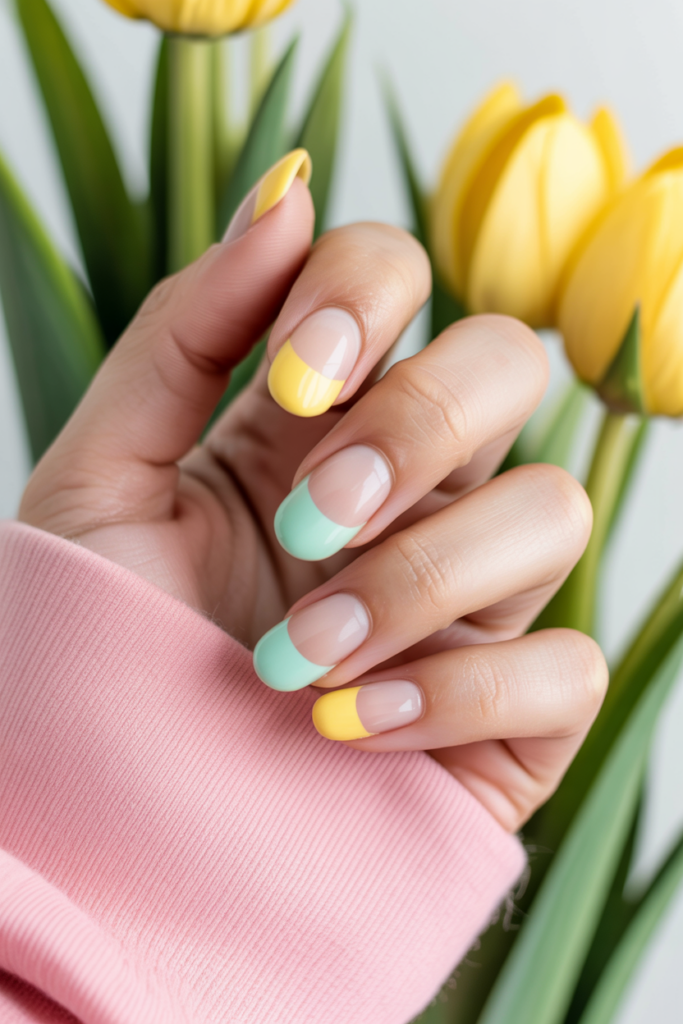 This look uses soft yellow and mint shades for a fresh, spring feel. The color-block design adds a modern twist without being too bold. It works well on square or almond-shaped nails, offering a clean and stylish option for April.