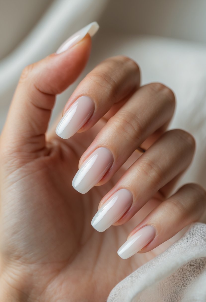 Milky white nails offer a soft, semi-sheer look that blends natural and polished styles. This finish lightly covers the nail, giving a clean and fresh appearance without being fully opaque.
