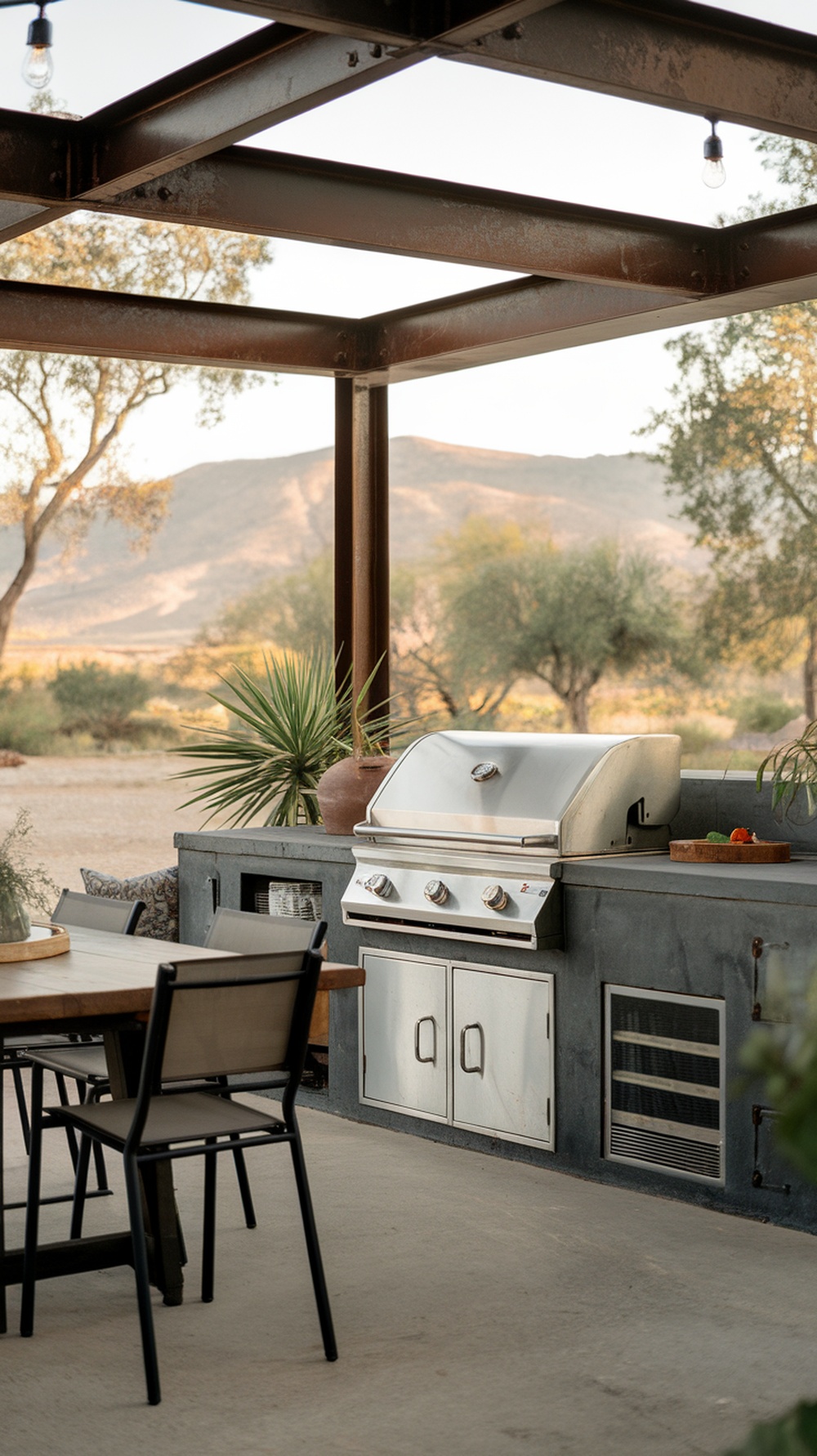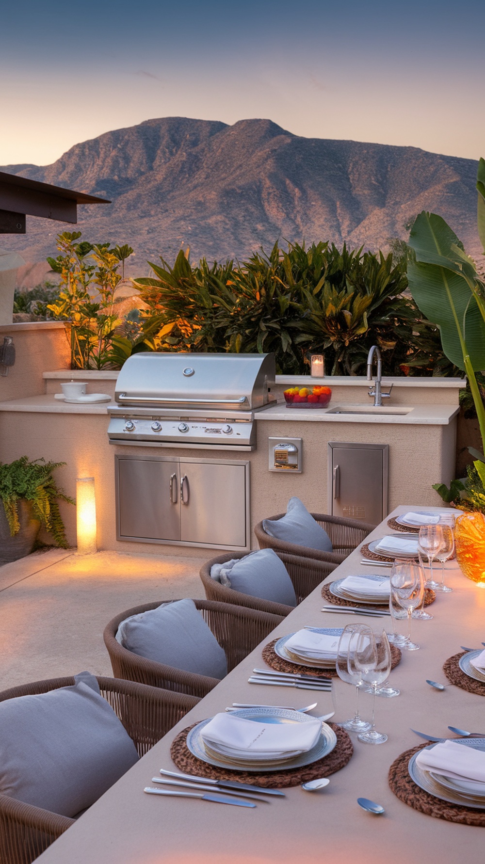 Imagine dining outdoors with a stunning backdrop of mountains. This outdoor kitchen is perfect for those who love to entertain while enjoying nature. The sleek grill and modern countertop make cooking a breeze, while the inviting dining setup encourages long meals with friends and family.