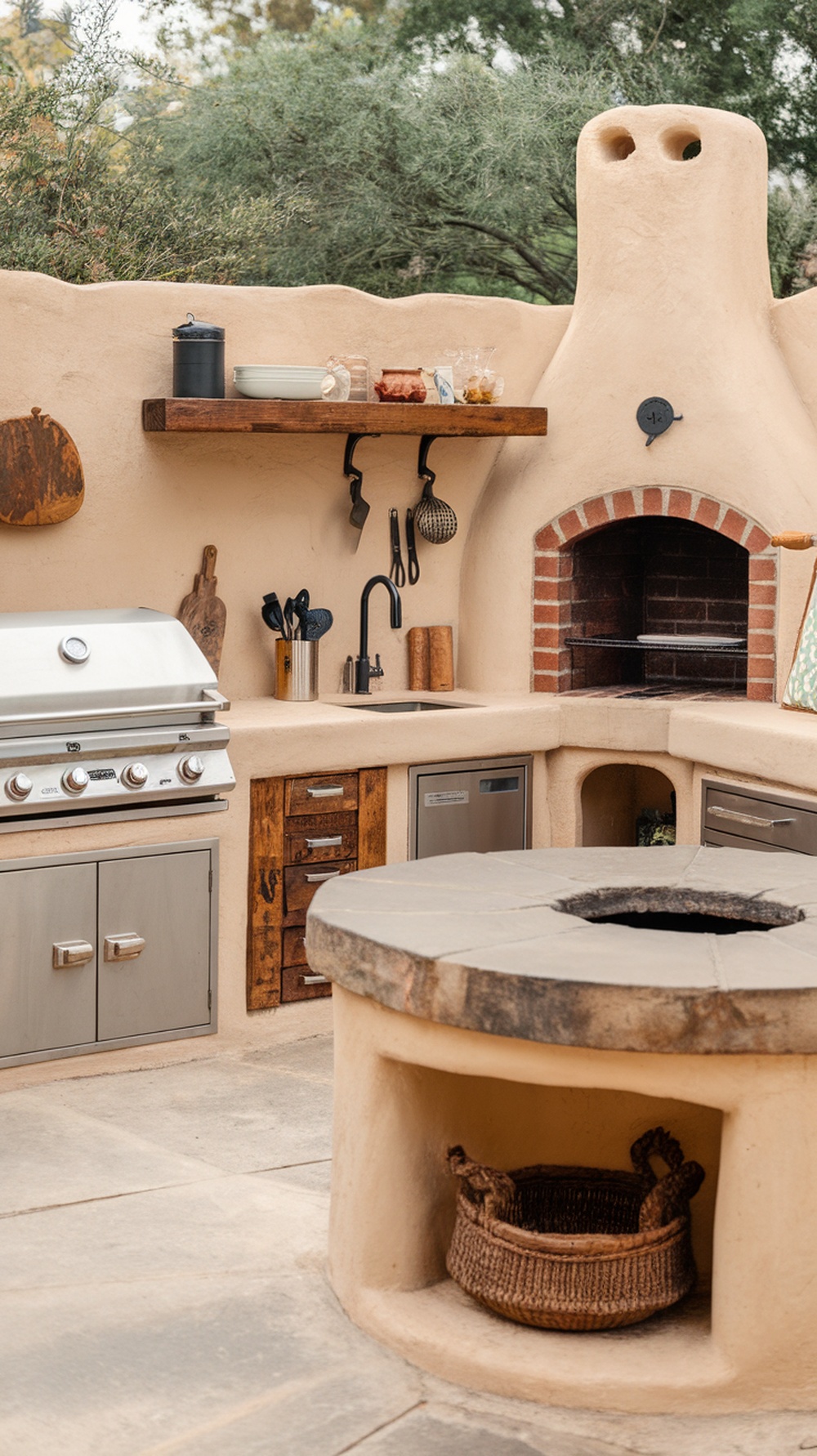 This artisan outdoor kitchen is a true gem. The design blends rustic charm with modern functionality. The curved walls and earthy tones create a warm, inviting space.