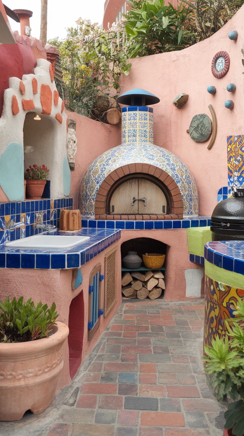 This outdoor kitchen is a feast for the eyes. The vibrant colors and unique shapes create a playful atmosphere. The curved oven, adorned with intricate tiles, stands out as a centerpiece. It’s not just a cooking space; it’s a work of art.