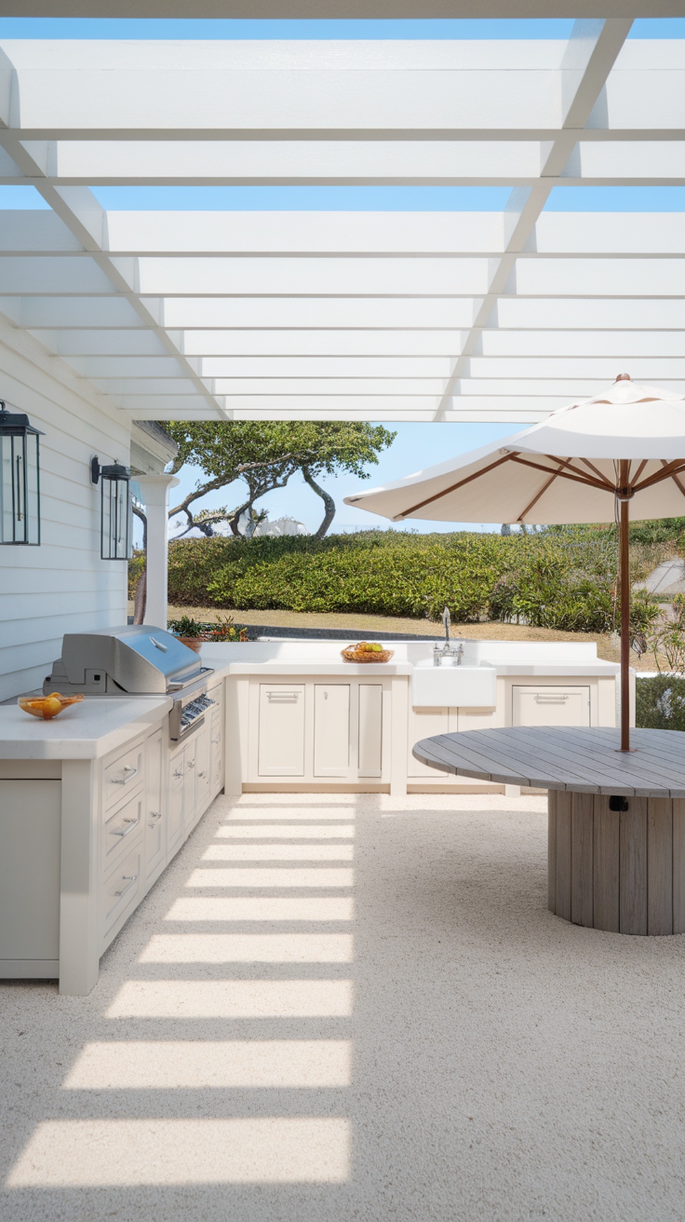 This outdoor kitchen captures the essence of coastal living. With its clean lines and light colors, it feels fresh and inviting. The setup includes a sleek grill, perfect for cooking up some delicious meals while enjoying the ocean breeze.