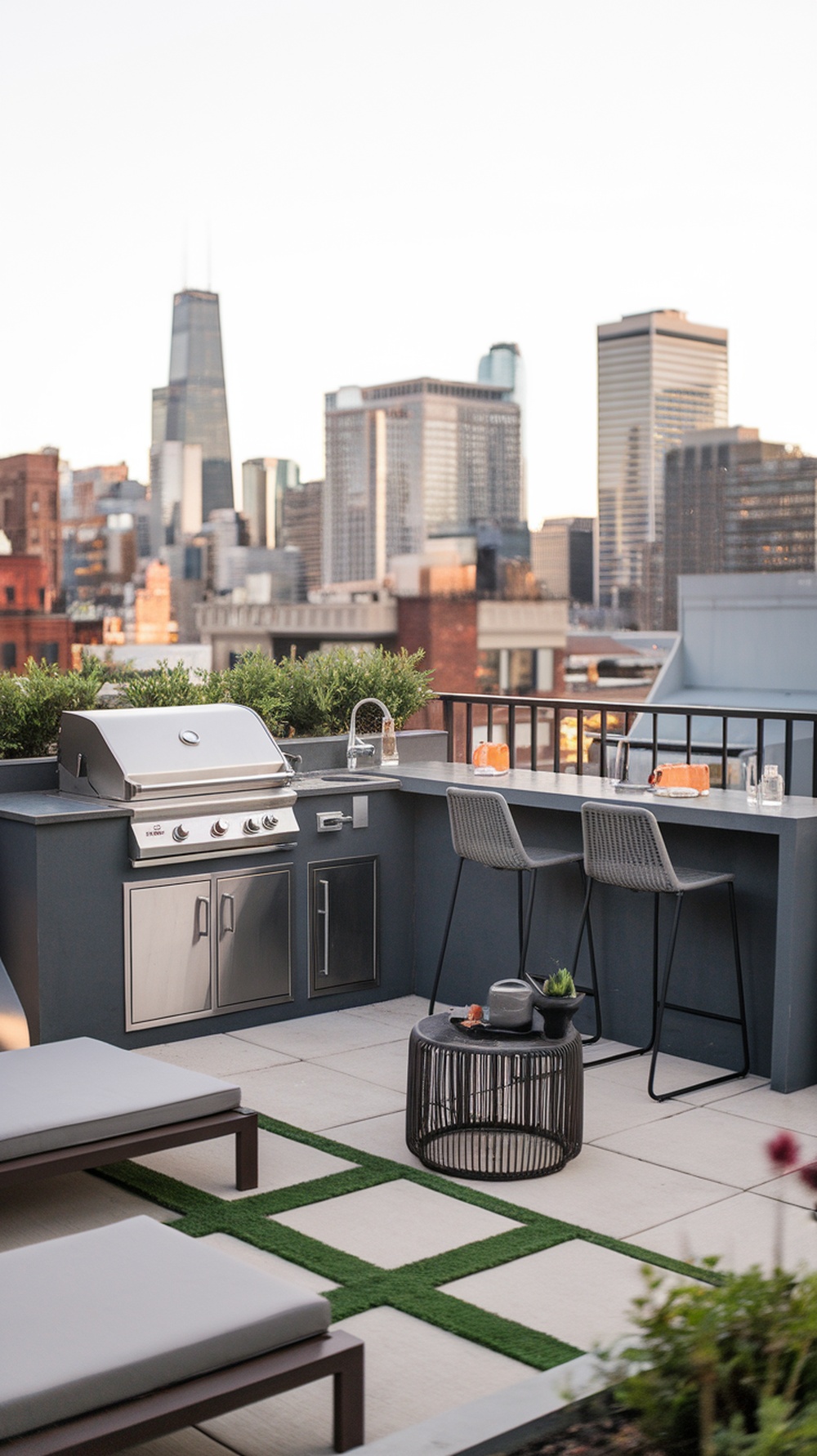 Picture this: a stunning rooftop outdoor kitchen that combines style and functionality. This space features a sleek stainless steel grill, perfect for whipping up delicious meals while enjoying the skyline view. The modern design includes a spacious countertop, making it easy to prepare food and serve drinks.