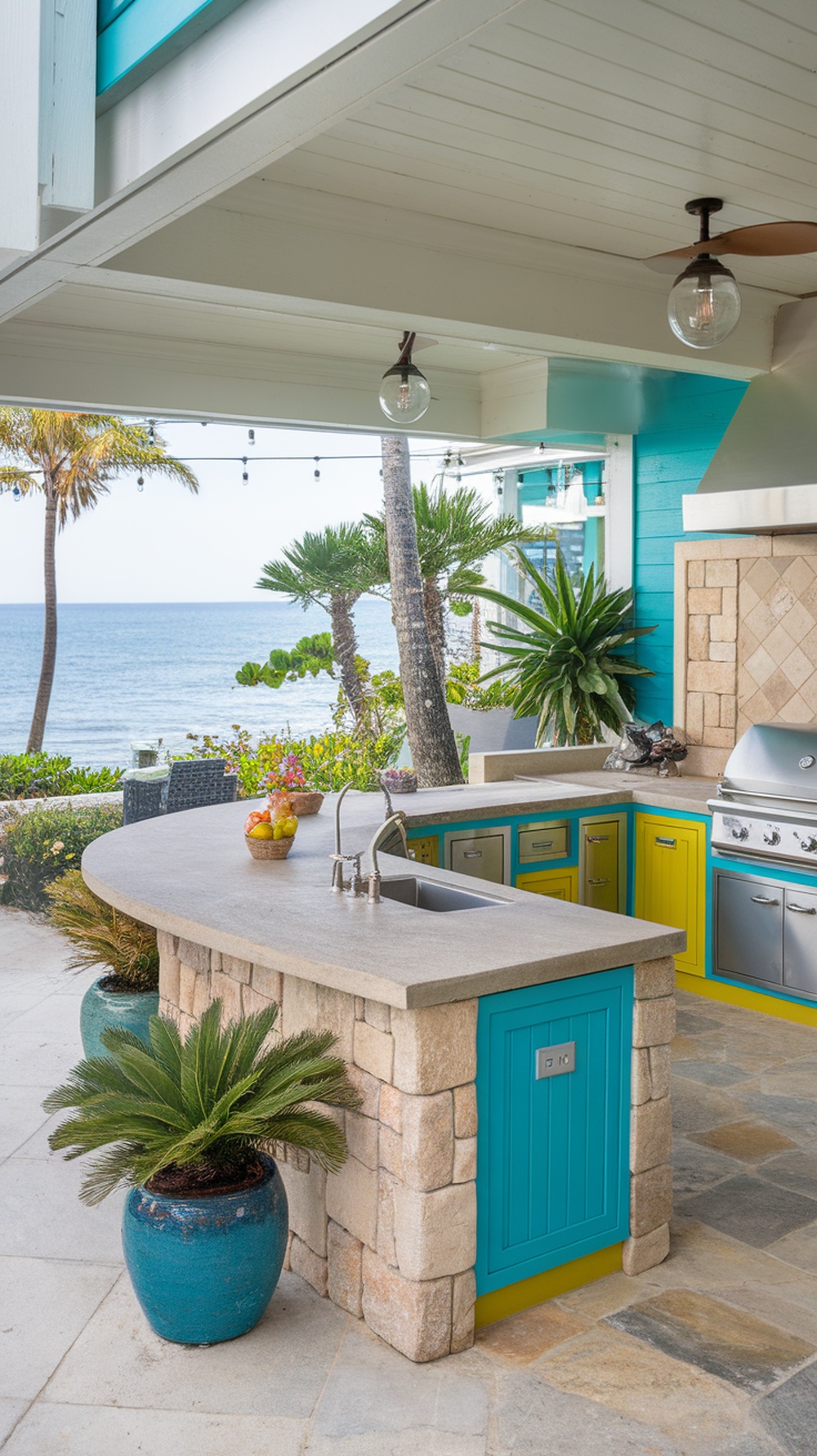 Imagine cooking up a storm while soaking in stunning ocean views. This outdoor kitchen captures the essence of coastal living perfectly. The vibrant colors of the cabinetry, like bright turquoise and sunny yellow, instantly lift the mood. They blend beautifully with the natural surroundings, creating a cheerful space.