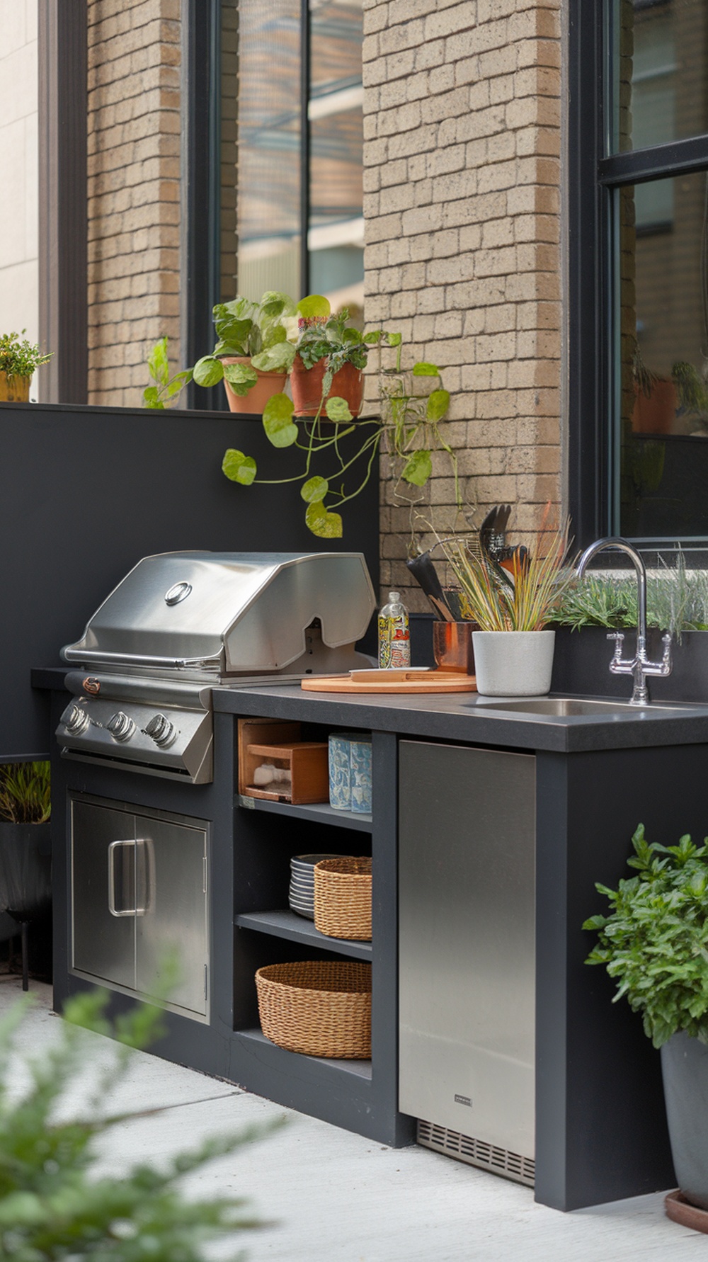 This compact kitchen proves that even in a bustling city, you can create a cozy outdoor cooking area that feels like a retreat.