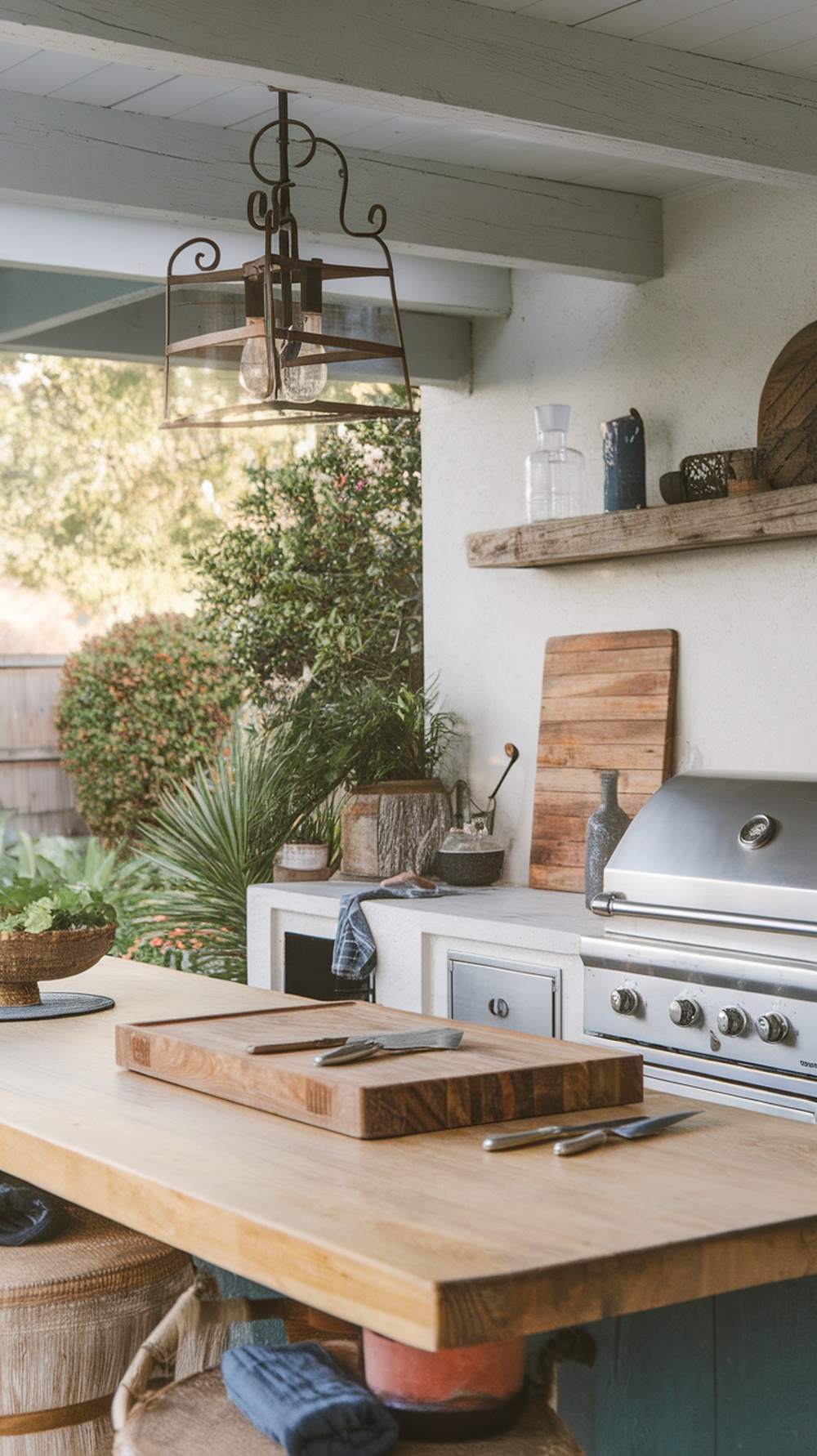 The image showcases a beautifully crafted outdoor kitchen. The large wooden table invites gatherings, while the sleek grill adds a modern flair. Natural elements like the greenery and wooden accents enhance the cozy vibe.